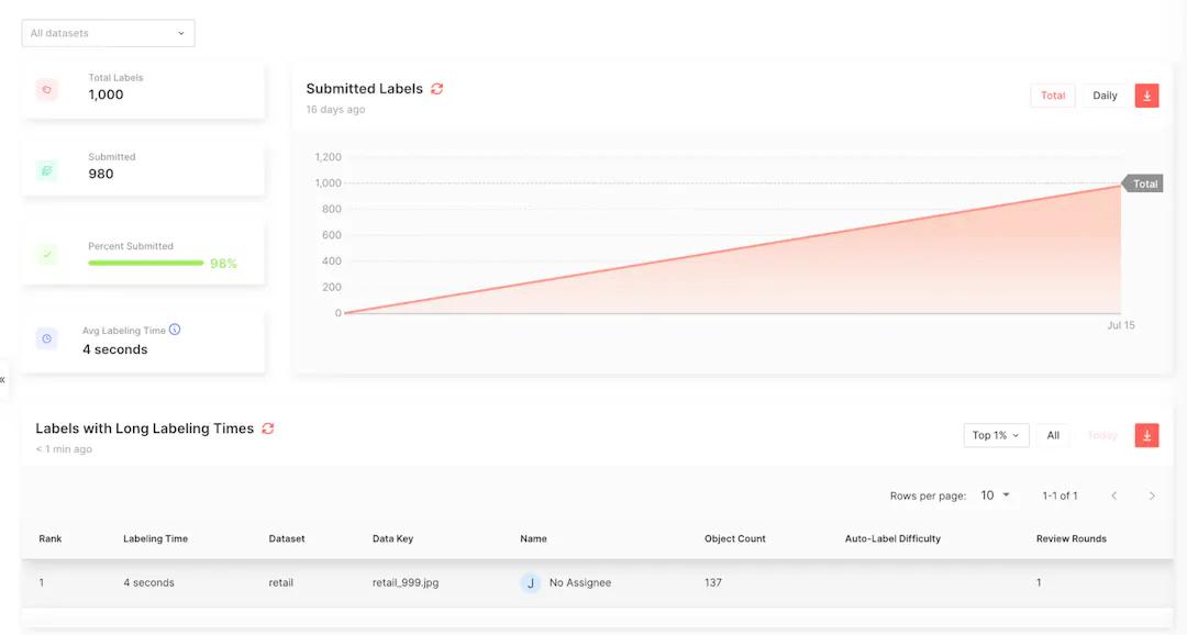 Tracking metrics such as the number of total labels, a breakdown of the data types and categories, user reports on individual labeler performance, and the ability to delve in deeper into specific dataset groupings to the most valuable and pertinent data to a project.
