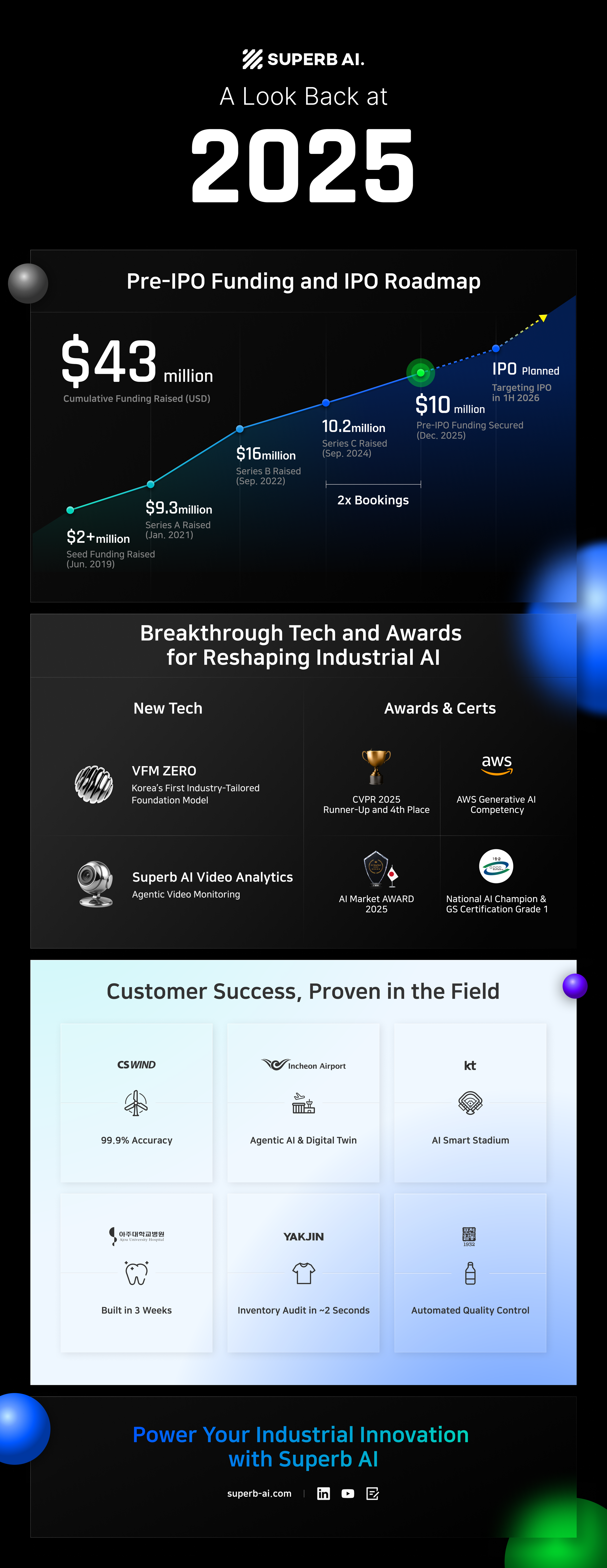 From securing $10 million (KRW 14 billion) in pre-IPO funding to launching Korea’s first industry-tailored vision foundation model, ZERO, and earning recognition at CVPR—the world’s largest computer vision conference—here’s a look back at Superb AI’s key milestones and changes in 2025, alongside an infographic.
