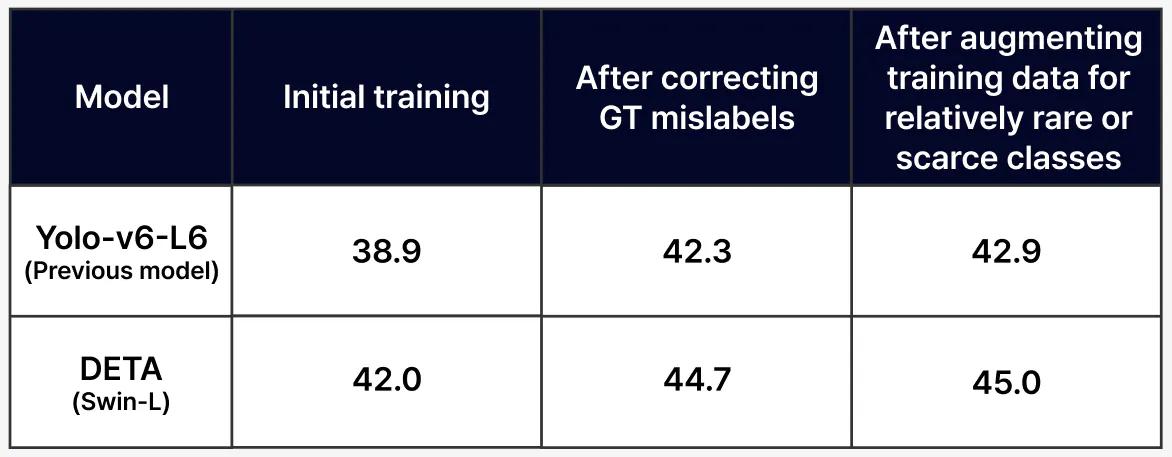 You can opt to try out other models offered in Superb Model to find the baseline model that best fits your dataset. However, it’s important to note that the data-centric approach, which involves diagnosing model performance, identifying vulnerabilities, and addressing them, remains consistent across different models. We chose the DETA (Swin-L) model from Superb Model and followed the aforementioned process. As observed, the patterns and trends in accuracy improvement are similar.