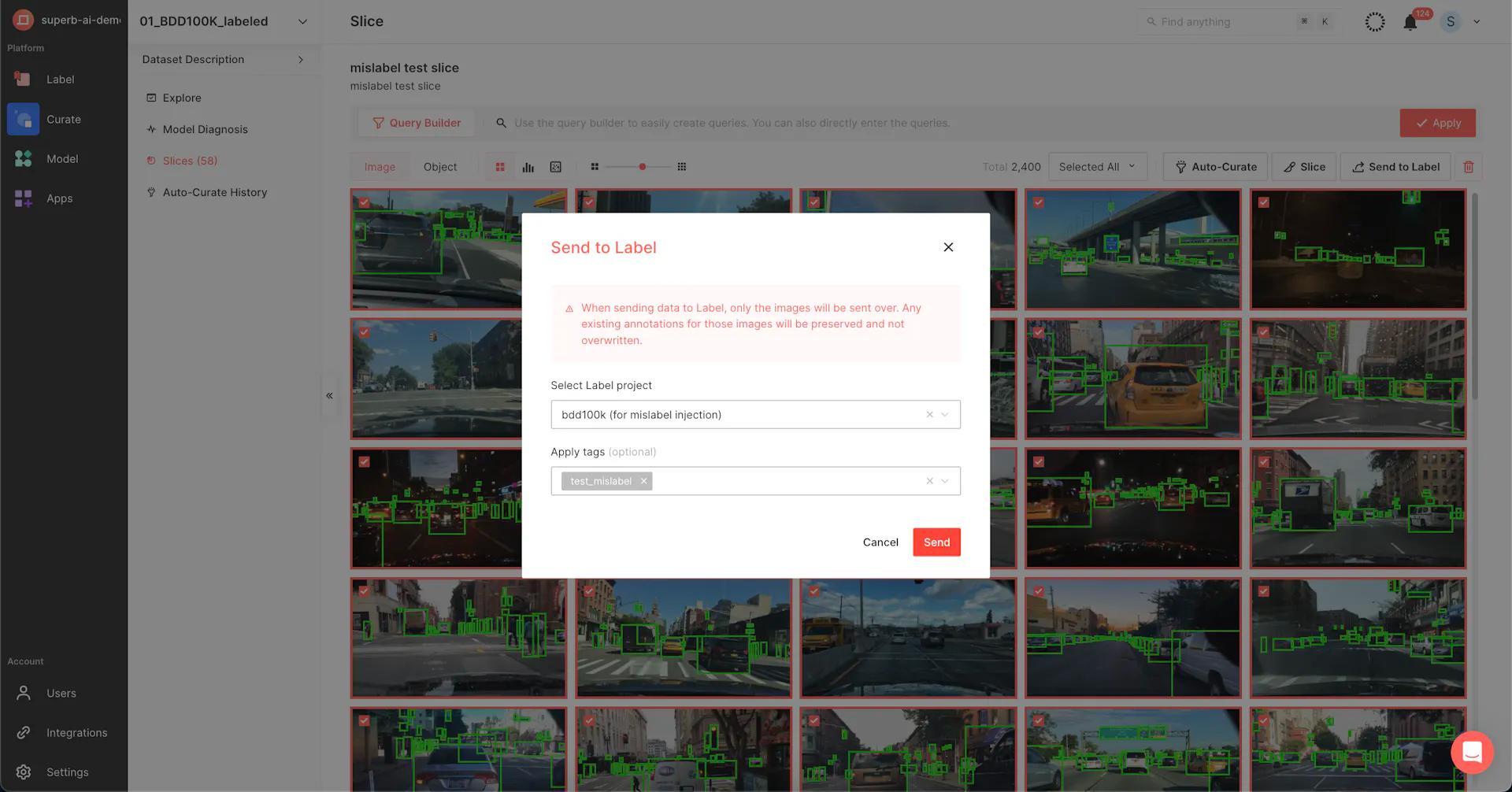 After successfully correcting all data, we will send the slice back to Superb Curate to prepare for re-training, using the “Send to Curate” feature (modified label slice).