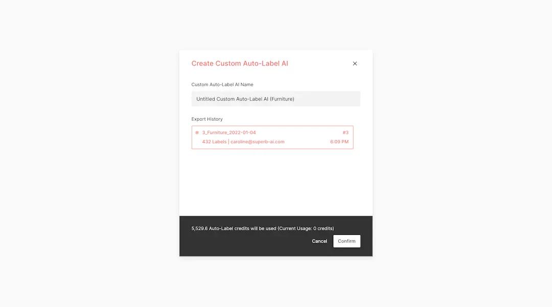 Do this by clicking on the “Label Exports” function in the Projects sidebar. Then, click on “Create a Custom Auto-Label AI.” Check the expected number of auto-label credits, and then click OK.