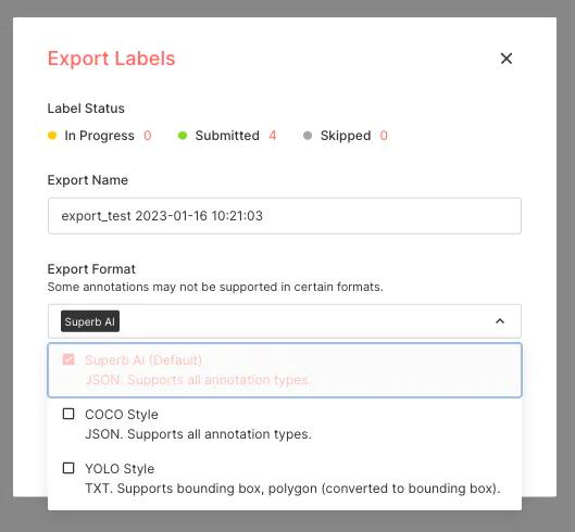 Teams can now export and use their labeled data more easily, without additional conversion, with support for common YOLO and COCO formats. Before these new formats, teams had to utilize the SDK or other methods to convert their files into the desired format, often with the support of our customer success team.