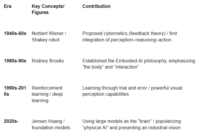 From the theoretical seeds of cybernetics, to Shakey’s historic first steps, to Rodney Brooks’ philosophical shift emphasizing the importance of the body, and finally to the arrival of foundation models as a powerful “brain,” physical AI has become an unstoppable trend—culminating in what Huang called the “next wave of AI.”