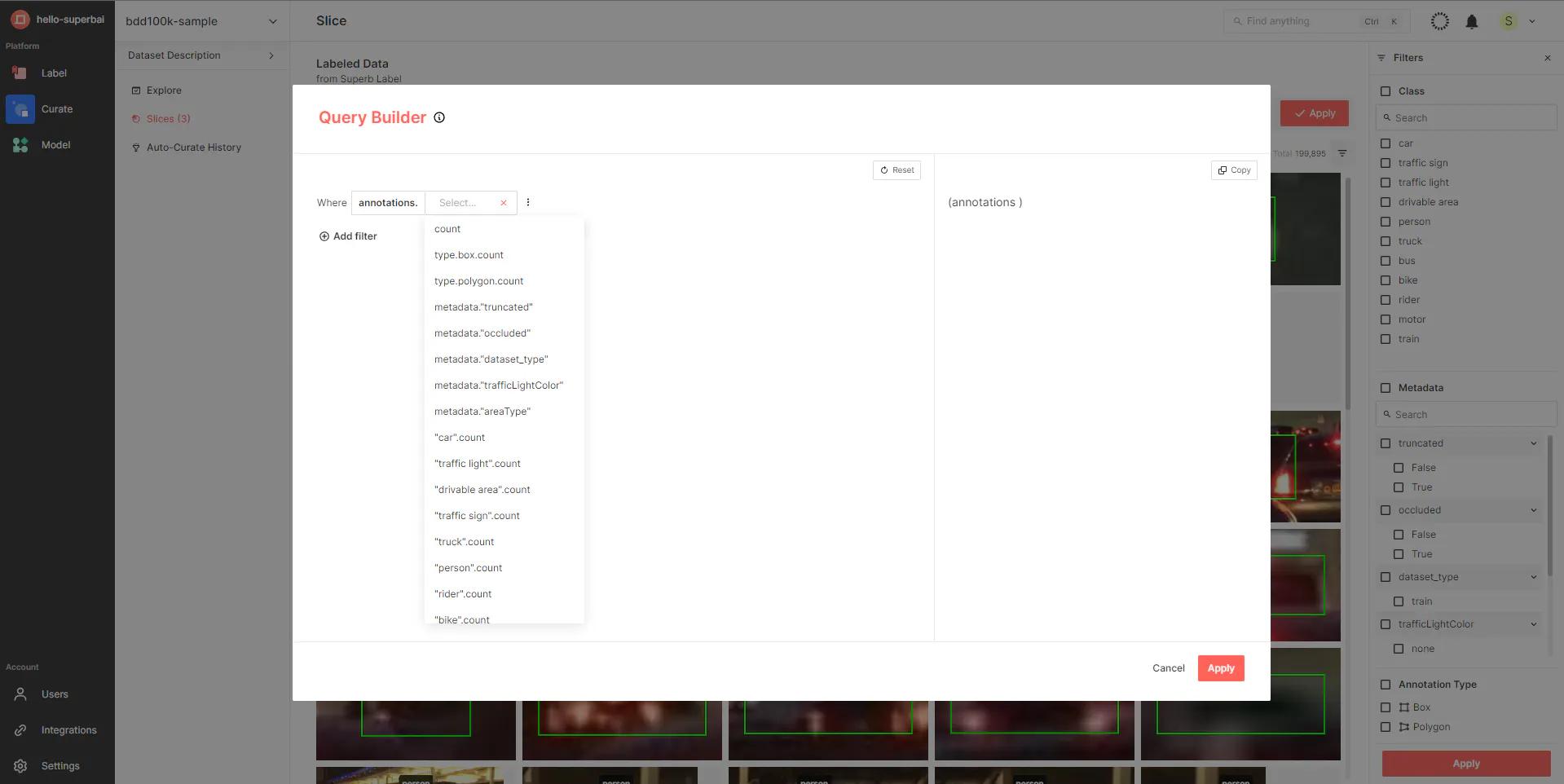 This month, we've released several key updates for Superb Curate that turn your scatter plot of image and object embeddings from “cool” to ‘must have,’ including the ability to query and slice on scatter view, see scatter views from queries and slices, and more. We’ve also added the ability to inspect your data on an object-by-object basis, with new views and functionality within the grid and scatter tabs.