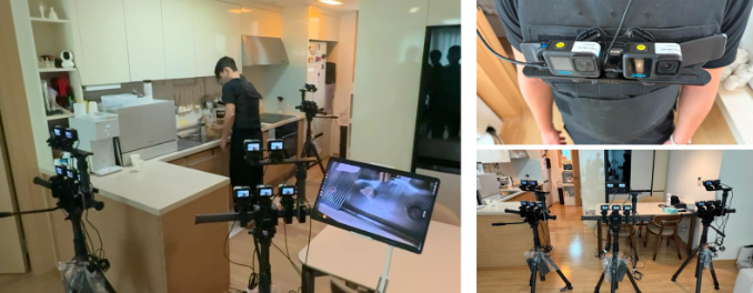 Even a simple calculation shows the scale of robot learning data required. In 50 home environments, 150 actions were performed—and recorded by 15 cameras—adding up to roughly 400 million frames.