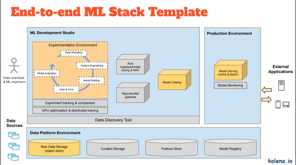 He then outlined the ML stack template as seen above (the yellow components should be prioritized):