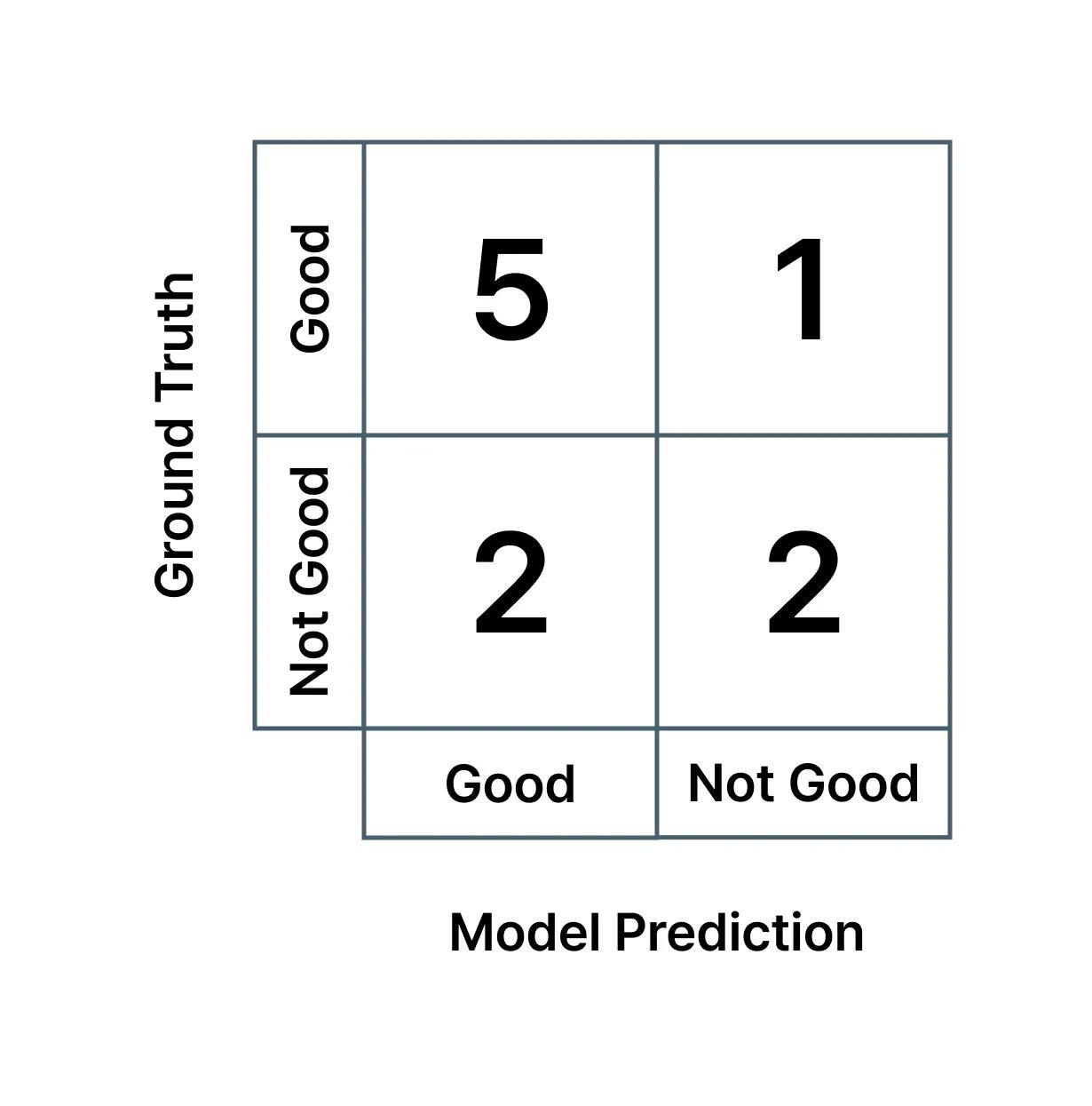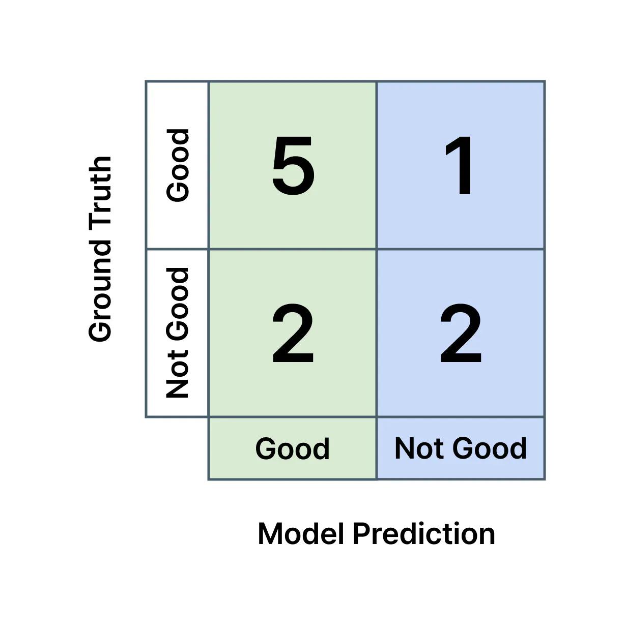 Precision is the proportion of correct predictions where the model-predicted classes align with the actual Ground Truth. For example, if a classification model in a factory has a Confusion Matrix as follows, the Precision for “Good” is calculated as 5/(5+2) = 0.71, and for “Not Good” as 2/(1+2) = 0.67, based on the figures in the green and blue columns respectively.