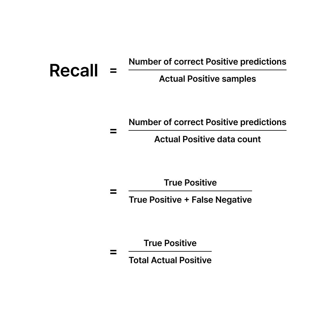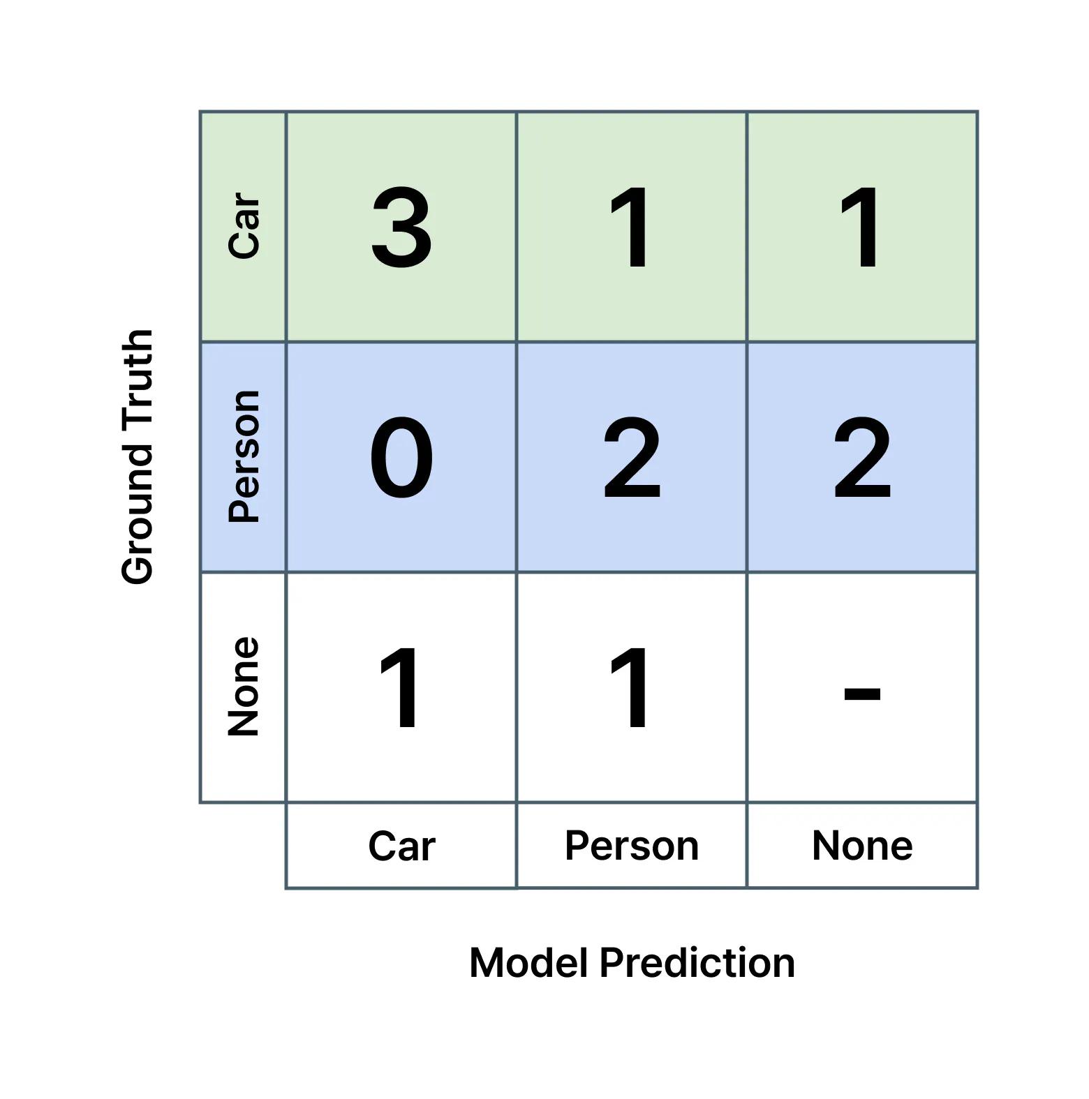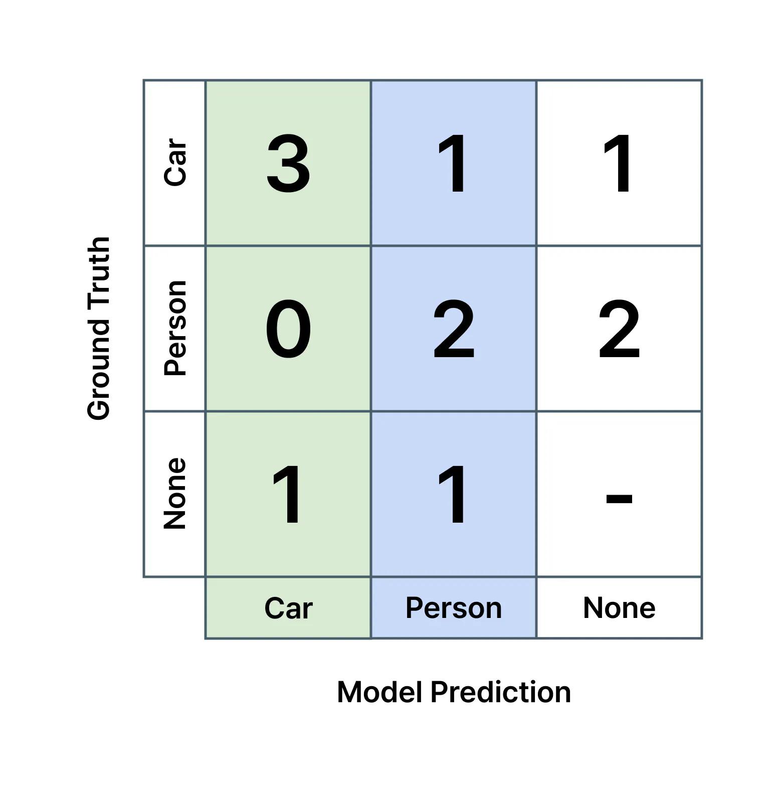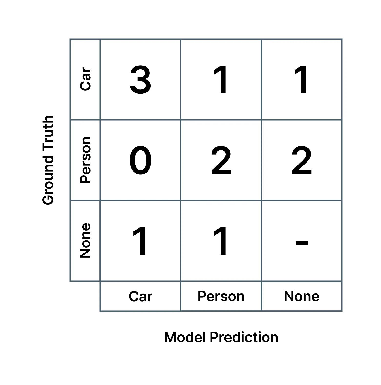 - If out of many images, a car is present 5 times and the AI model correctly identifies it 3 times, mistakes it for a person once, and misses it once,