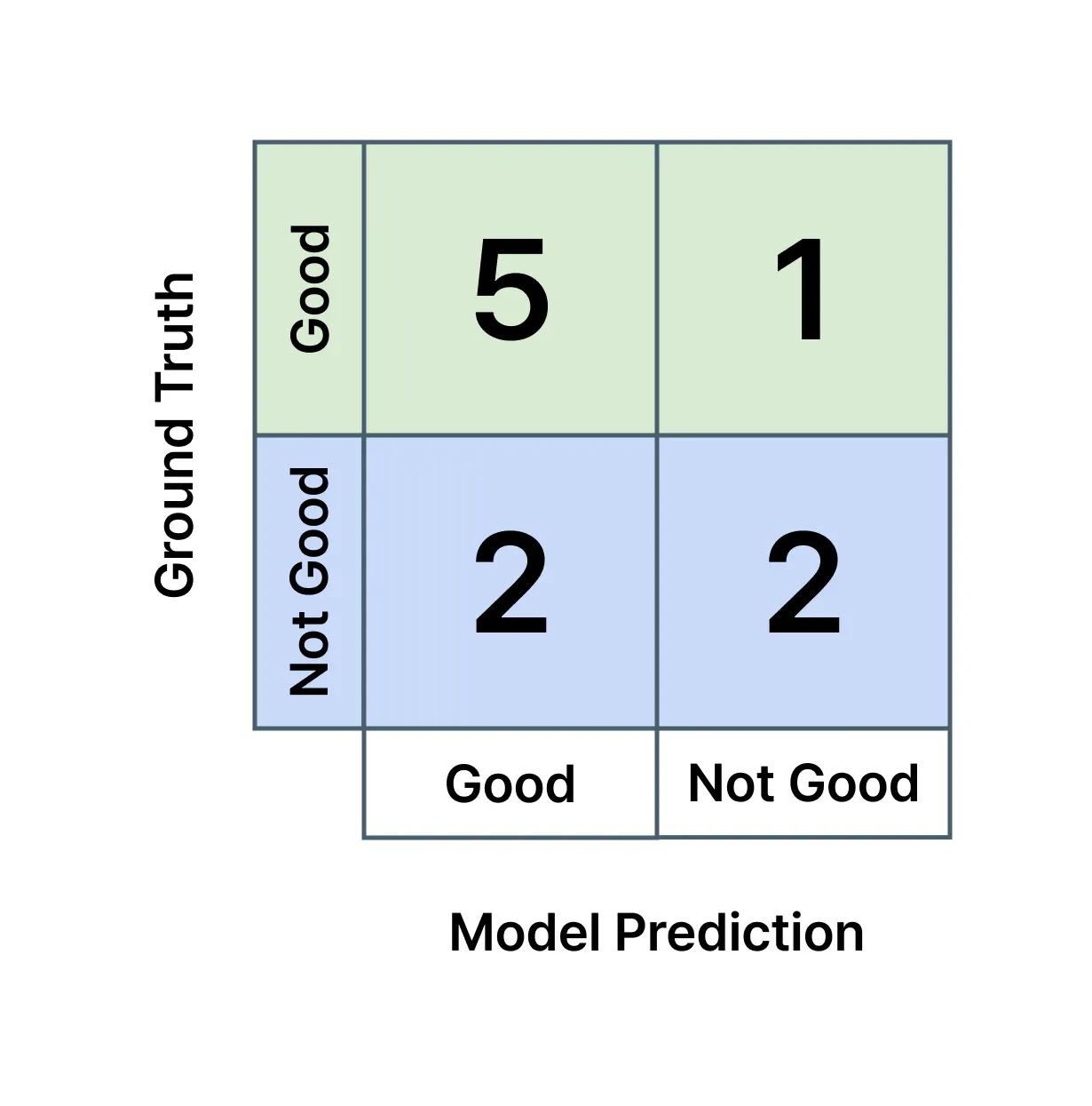 Recall is the proportion of actual Ground Truth classes that were correctly predicted by the model. For instance, if a classification model in a factory has a Confusion Matrix as shown, the Recall for “Good” is 5/(5+1) = 0.83, and for “Not Good” is 2/(2+2) = 0.5, calculated from the green and blue columns respectively.