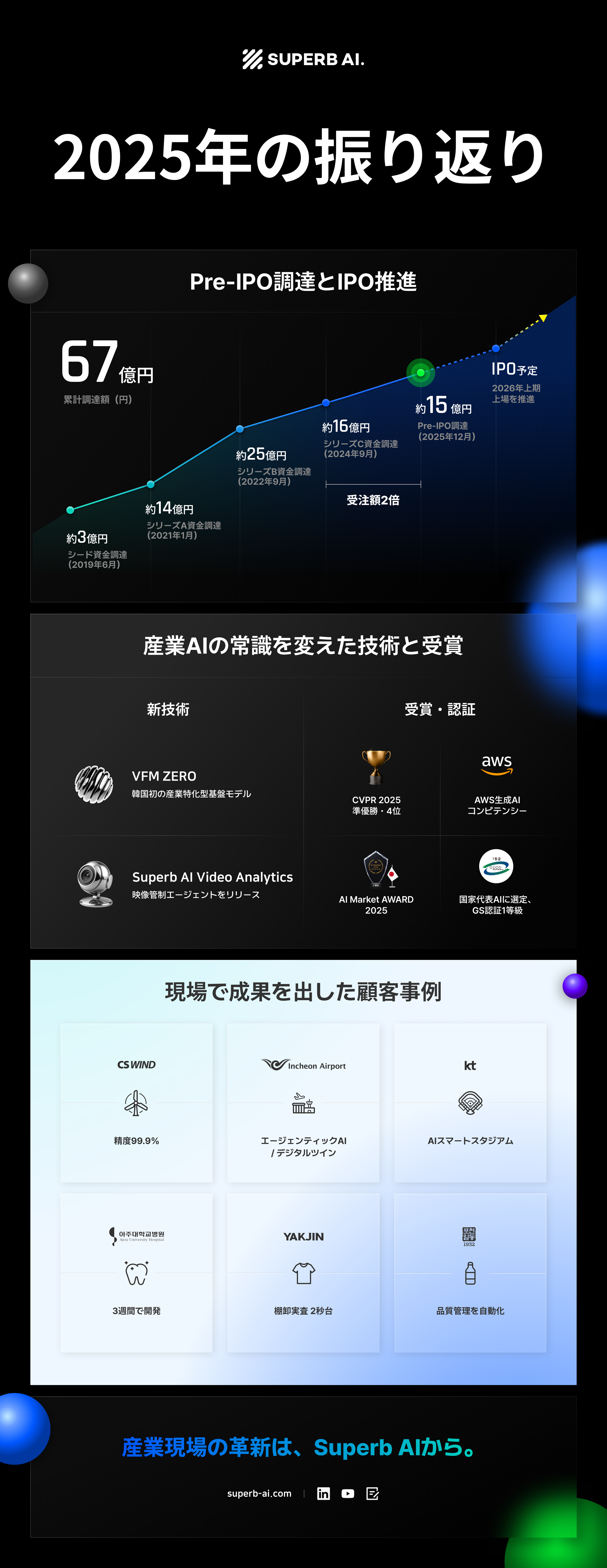 Pre-IPOでの約15億円(140億ウォン)調達、韓国初の産業特化型ビジョン基盤モデル「ZERO」のローンチ、そして世界最大のコンピュータビジョン会議であるCVPRでの評価獲得まで。2025年におけるSuperb AIの主要な成果と変化を、インフォグラフィックとともに振り返ります。