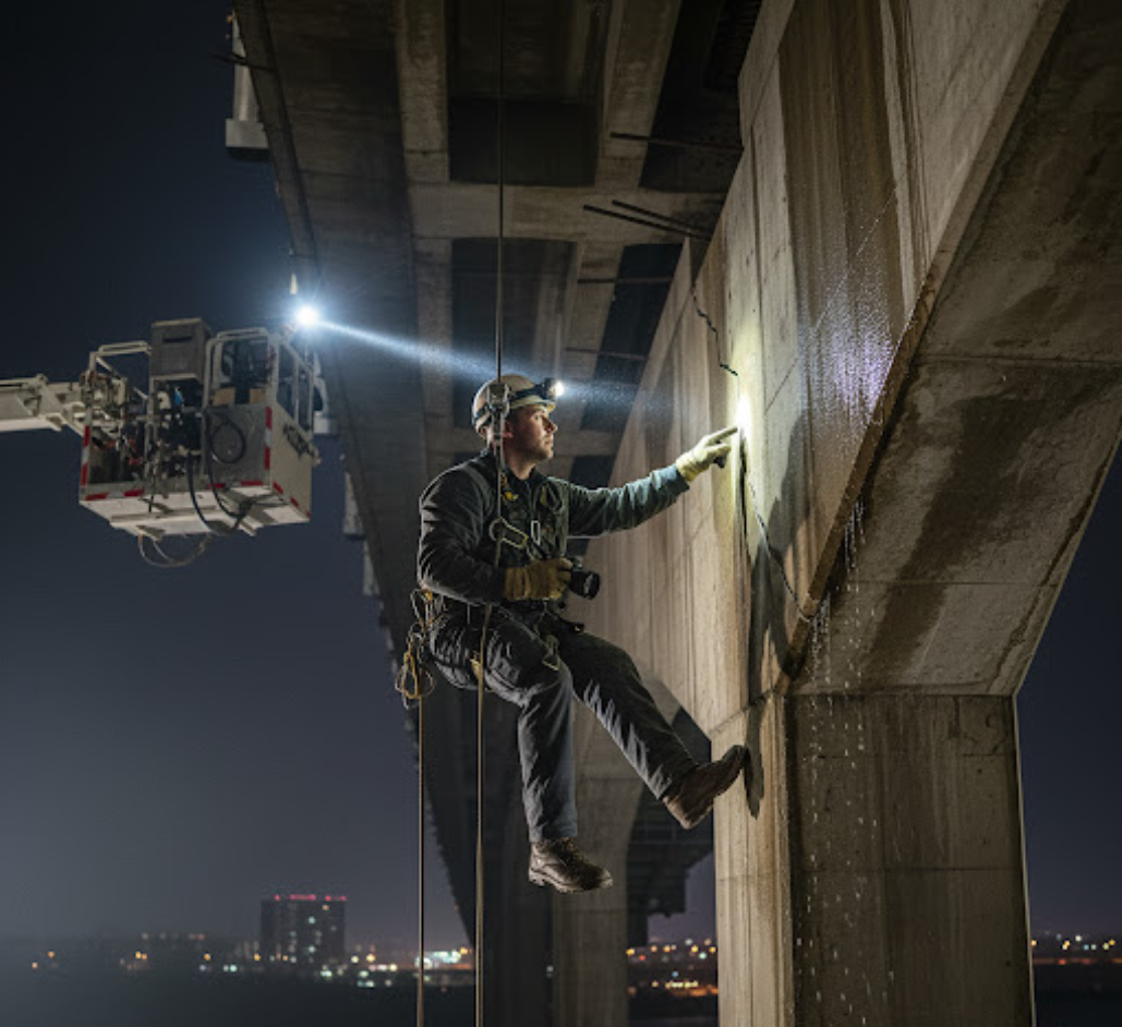 - 主観的判断と見逃しのリスク: 従来の検査では、熟練したエンジニアがロープや特殊車両を用いて橋梁の桁下やトンネル内部に直接接近し、目視で損傷や欠陥を確認していました。この方法では、検査品質が作業者の経験値やその時々のコンディションに大きく左右されます。とりわけ、将来的に構造物崩壊につながり得る「初期の微小ひび割れ」や「コンクリート剥離の兆候」は肉眼での判別が難しく、安全上の見逃しリスク(死角)が常に存在していました。