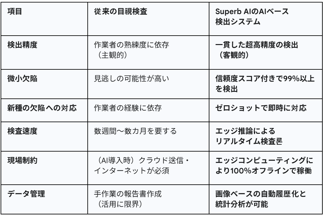 以下の表は、従来の目視検査とSuperb AIベースの検出システムの主要な違いをまとめたものです。