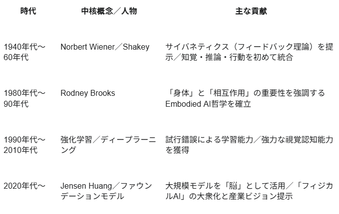 しかし、その根底にある発想——すなわち「身体を持ち、物理世界と相互作用し、その相互作用を通じて学ぶ知能」——は、AI研究の黎明期から存在していました。その進化は大きく4つの段階で捉えられます。