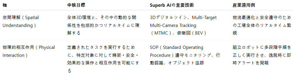 この二つの軸は、フィジカルAIが直面する視覚知能の複雑さを体系的に解決するための、Superb AIの明確なロードマップを示しています。