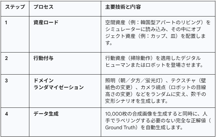 構築した3つの資産は、NVIDIA Isaac Simベースのパイプラインで統合され、ここで「合成データ」が大量生産されます。これが、フェーズ2が単なるデータ加工ではなく「技術的R&D」課題として定義される理由です。