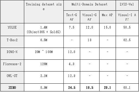『ZERO』の産業適用性を検証するために、Superb AIはマルチドメインの産業用データセットを用いた独自のベンチマークを構築し、計37の産業分野を対象にテストを実施。テキストベースの検出(Text AP)、画像ベースの検出(Visual AP)、そして総合指標(Max AP)のすべてにおいて、グローバルのトップモデルを上回る結果を示した。製造、物流、小売、セキュリティといった幅広い産業分野において、確かな競争力を実証したことになる。