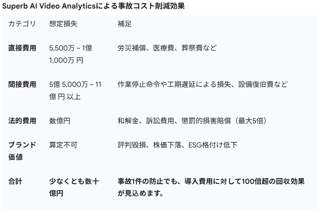 - 事故関連コストの回避:安全執行が強化される中、重大事故のコストには、法務費用、高額な罰金、作業停止による売上損失、長期的な評判毀損などが含まれ、極めて大きな総額に達し得ます。軽微な事故であっても1件防止できれば、投資回収(ROI)を即時に達成することも可能です。