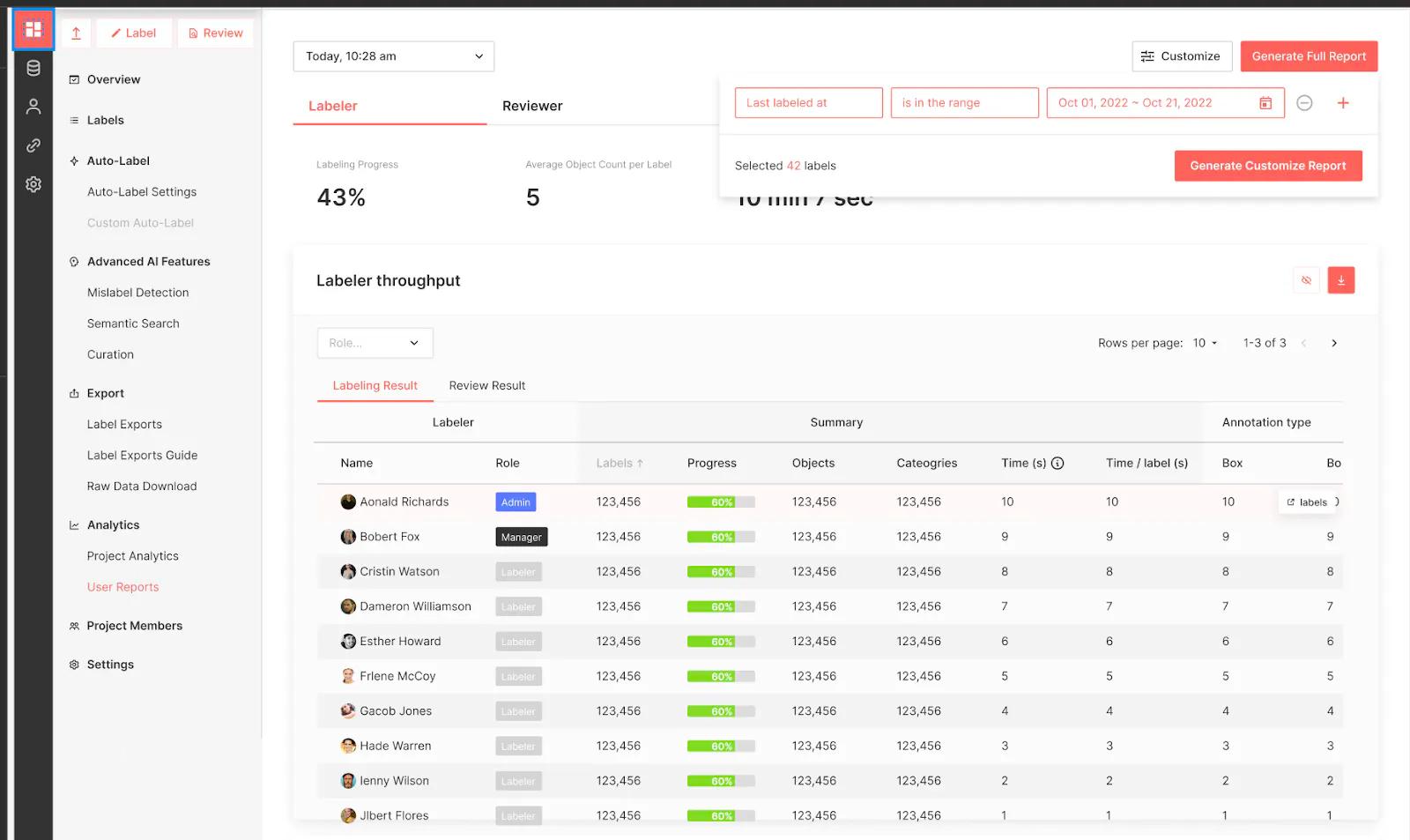 Managers and owners can now create customized user reports highlighting a labeler’s progress and throughput for selected dates or a range of dates. Included are shortcuts for today, this week, and this month, making it easier to reference a user’s progress during a specific timeframe.